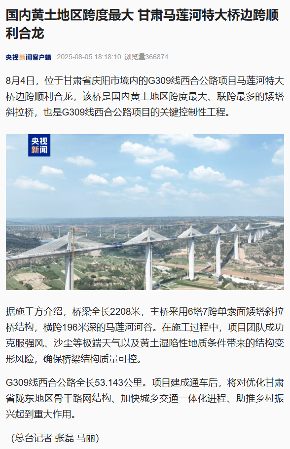 - 甘肅工程咨詢集團(tuán)監(jiān)理項(xiàng)目取得重大突破:國內(nèi)黃土地區(qū)跨度最大 甘肅馬蓮河特大橋邊跨順利合龍